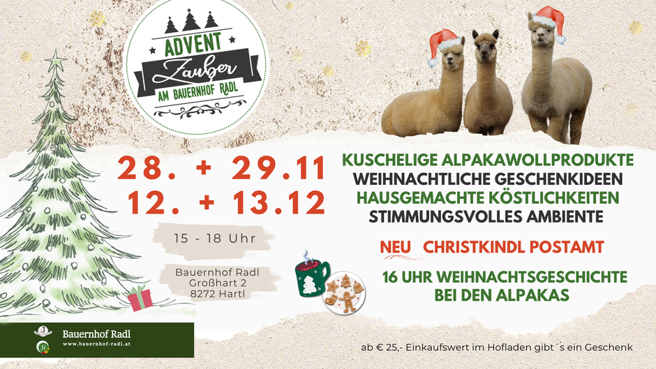 Den Advent in gemütlicher stimmungsvoller Atmosphäre genießen, mit den Alpakas ein Selfie knipsen und ländliche Weihnachtsgeschenke stöbern..... dies alles kann man beim Advent Zauber am Bauernhof Radl.